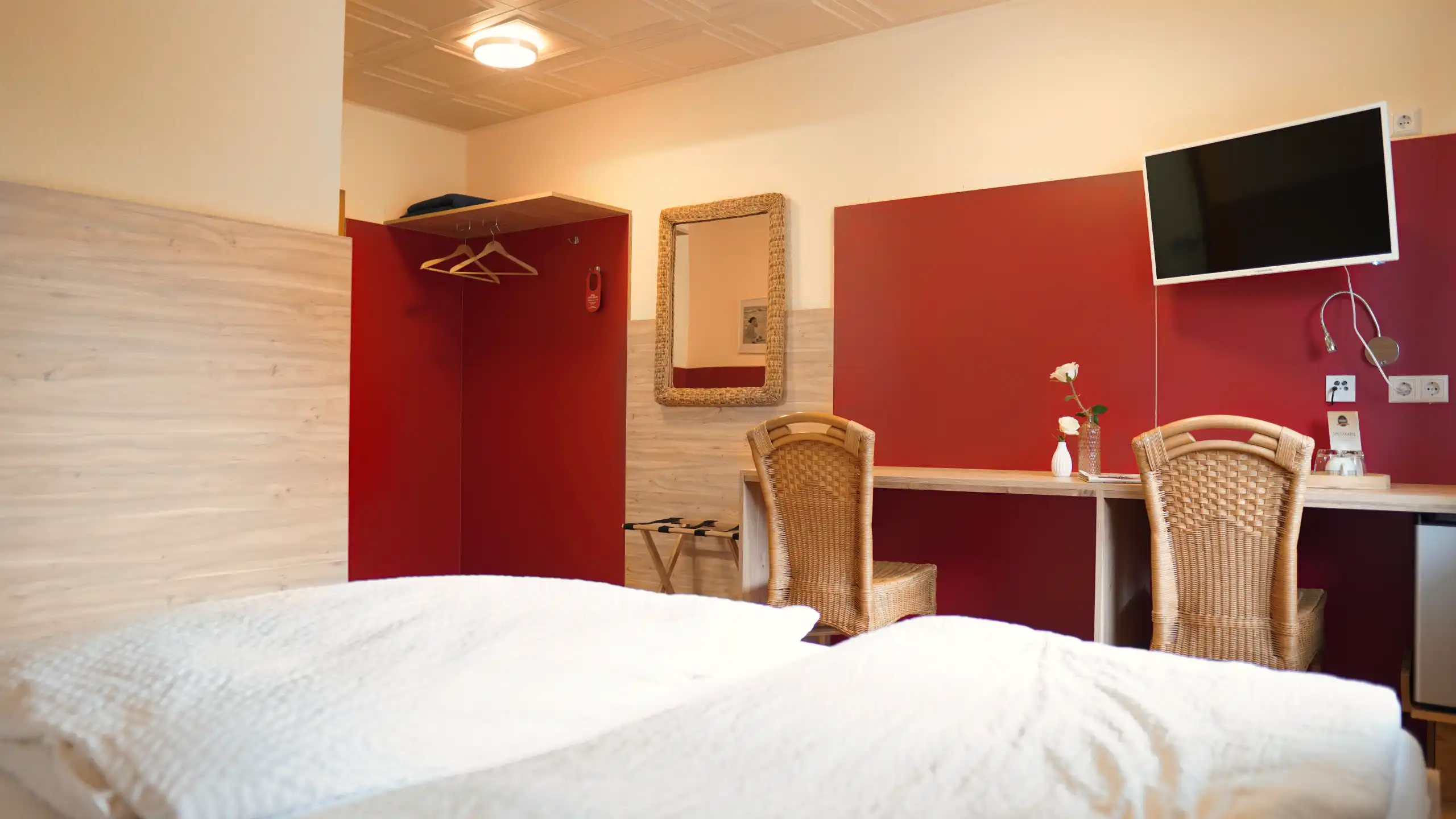 Unsere Doppelzimmern sind alle mit Doppelbetten, Flachbildfernseher, Schreibtisch, Stuhl und